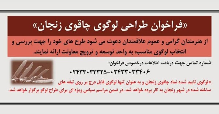 معاون صنايعدستي و هنرهاي سنتي استان زنجان از فراخوان طراحي لوگوي چاقوي زنجان توسط معاونت صنايعدستي خبر داد.