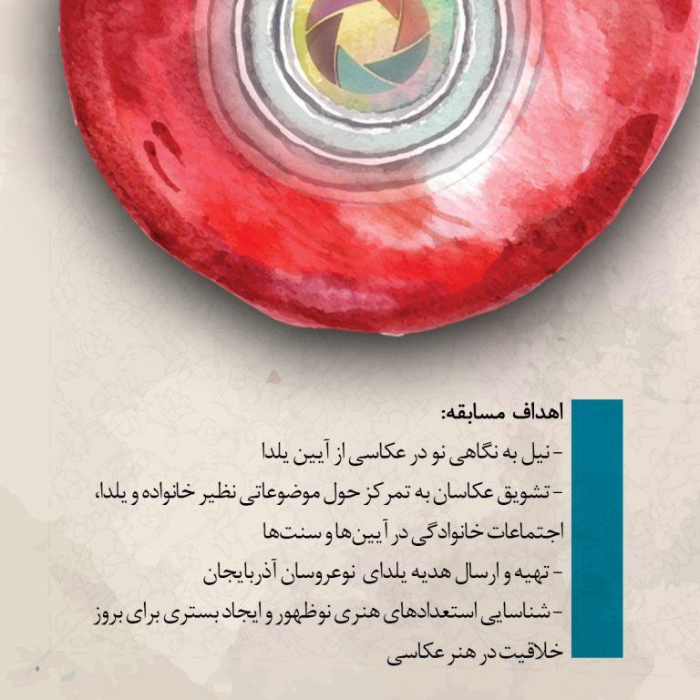 به‌گزارش گالري آنلاين به نقل از ميراث آريا، داوود فرازي با اعلام اين مطلب اظهار کرد: نيل به نگاهي نو در عکاسي از آيين يلدا، تشويق عکاسان به تمرکز حول موضوعاتي نظير خانواده و يلدا، اجتماعات خانوادگي در آيين‌ها و سنت‌ها، تهيه و ارسال هديه يلداي نوعروسان استان و شناسايي استعدادهاي هنري نوظهور و ايجاد زمينه اي براي بروز خلاقيت در هنر عکاسي از جمله اهداف برگزاري اين مسابقه هستند.