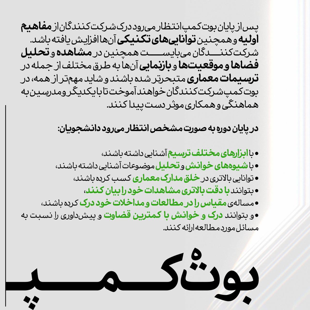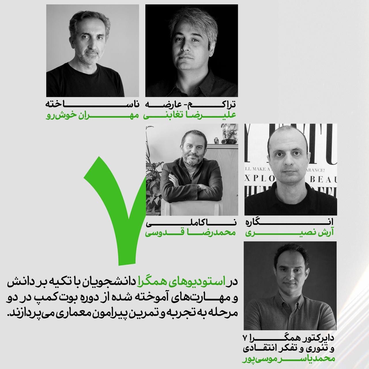 در استوديوهاي همگرا دانشجويان با تکيه بر دانش و مهارتهاي آموخته شده از دوره بوتکمپ در دو مرحله به تجربه و تمرين پيرامون معماري ميپردازند. بخش اول که داراي بار تحليلي است کمک ميکند تا دانشجو بتواند پديده پيش روي خود را اعم از بخشي از شهر يا يک اثر تاريخي معماري، با مشاهده موشکافانه مورد تحليل قرار دهد و اين تحليل خود را در قالب مدلهاي فيزيکي و يا ترسيمات به صورت يک بيانيه ارائه نمايد.