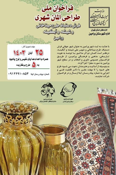 رئيس اداره ميراثفرهنگي، گردشگري و صنايعدستي شهرستان ورامين، از انتشار فراخوان ملي طراحي المان شهري شيشه، آبگينه و فرش ورامين با همکاري شهرداري اين شهر خبر داد.