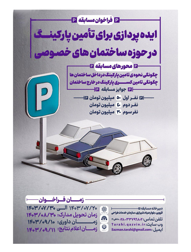 از ايده پردازان و افراد خلاق دعوت ميشود تا ايده هاي خود در زمينه نحوه تأمين پارکينگ در فضاي ساختمانها را به دبيرخانه مسابقه «ايده پردازي براي تامين پارکينگ در حوزه ساختمانهاي خصوصي» براي حل مسائل و چالشهاي پيش روي کلانشهر قزوين به شهرداري قزوين ارسال نمايند.