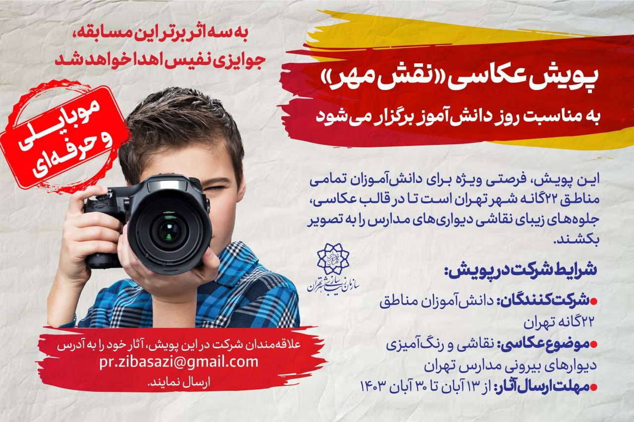 سازمان زيباسازي به مناسبت روز دانشآموز، پويش عکاسي «نقش مهر» را برگزار ميکند.