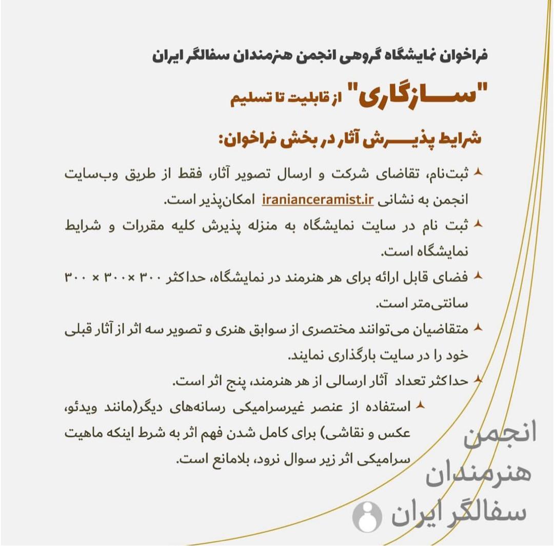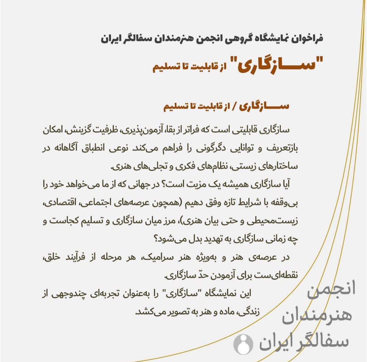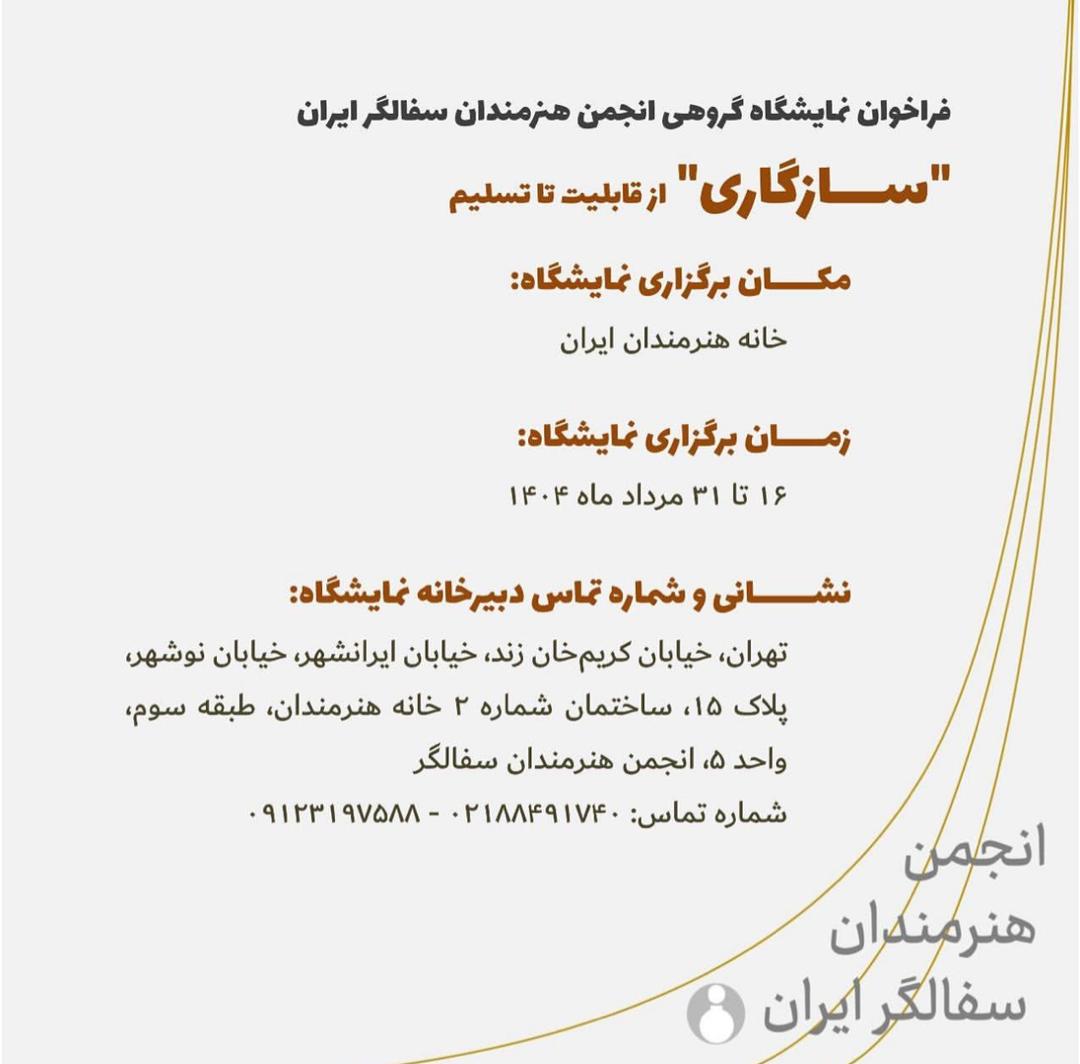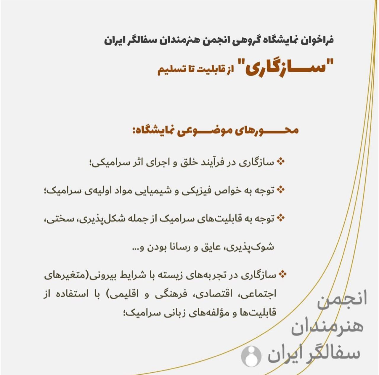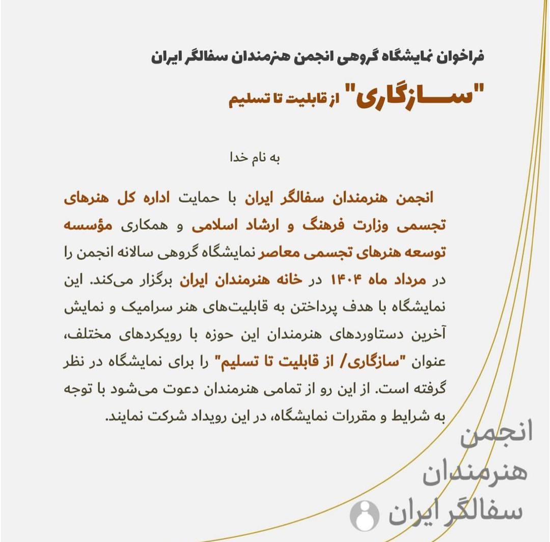 انجمن هنرمندان سفالگر ايران با حمايت اداره کل هنرهاي تجسمي وزارت فرهنگ و ارشاد اسلامي و همکاري موسسه توسعه هنرهاي تجسمي معاصر نمايشگاه سالانه انجمن را در مرداد ماه ۱۴۰۴ در خانه هنرمندان ايران برگزار ميکند.