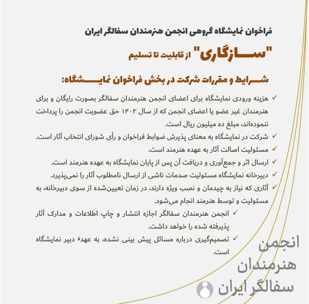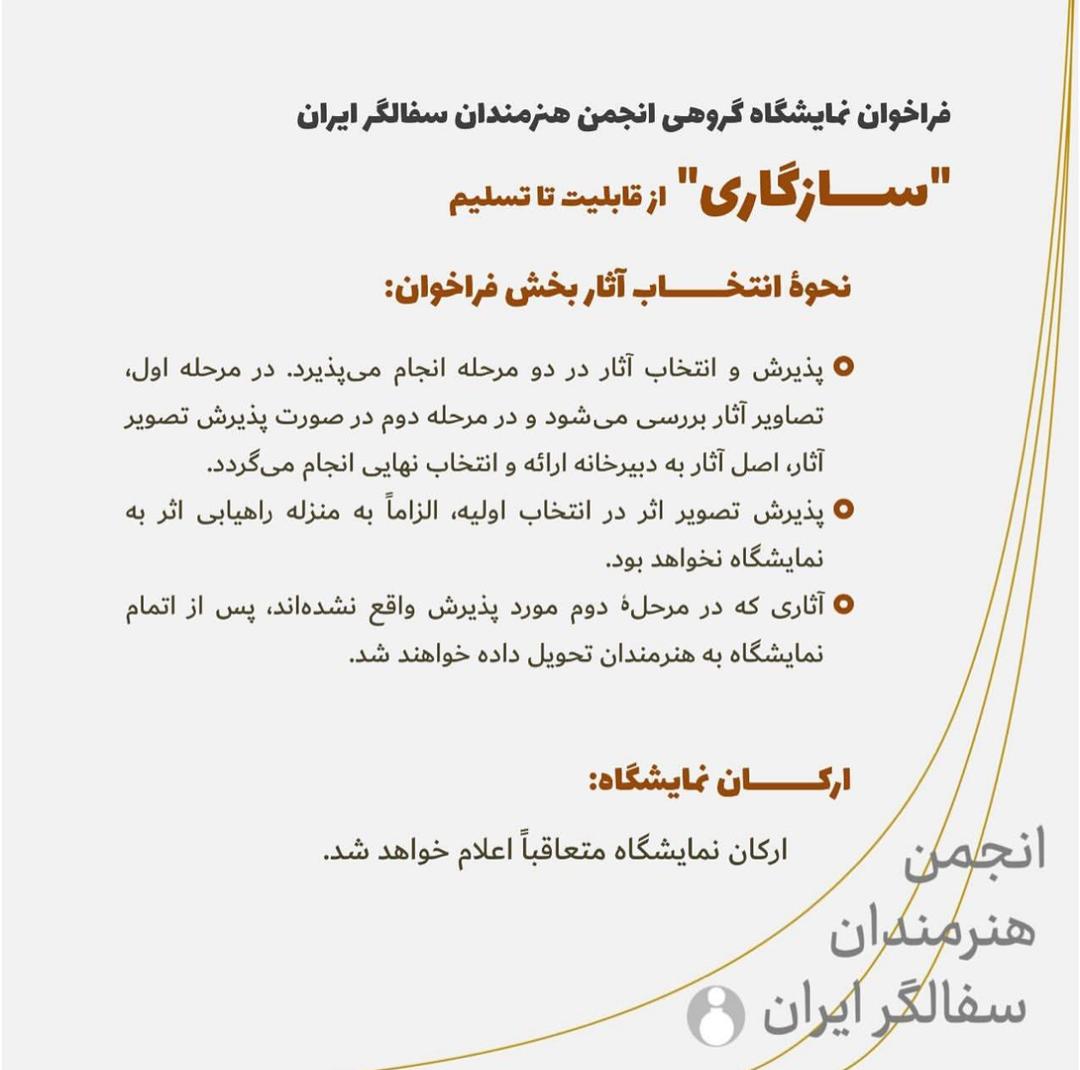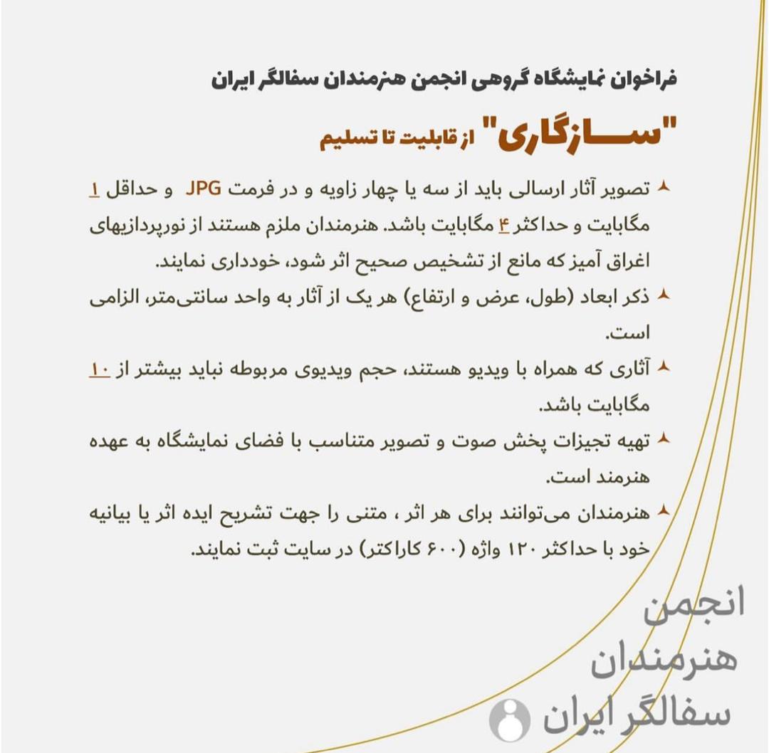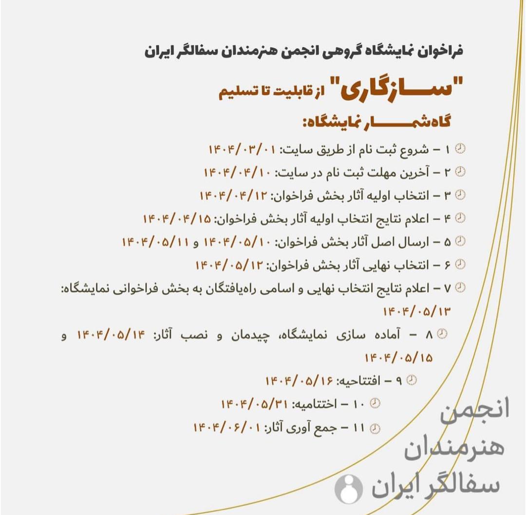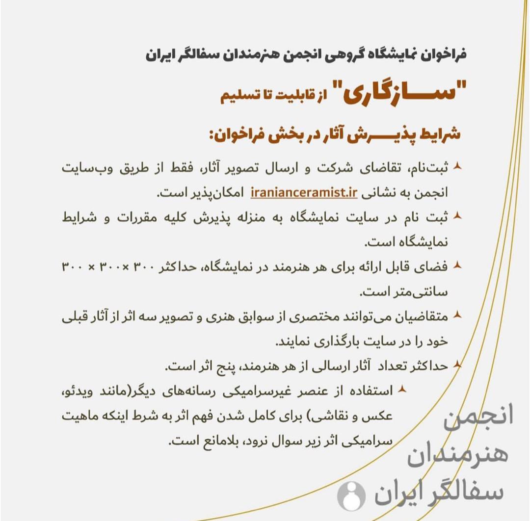 انجمن هنرمندان سفالگر ايران با حمايت اداره کل هنرهاي تجسمي وزارت فرهنگ و ارشاد اسلامي و همکاري موسسه توسعه هنرهاي تجسمي معاصر نمايشگاه سالانه انجمن را در مرداد ماه ۱۴۰۴ در خانه هنرمندان ايران برگزار ميکند.