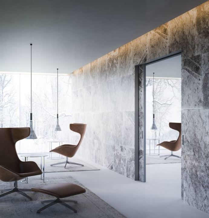 Consider highlighting the door as a work of art. At times, contrasting materials or colors can be very interesting. Even so, if the idea is that nothing but the operable panel appears, Extruded aluminium frame replaces the frame (outer frame-posts) and adapts to walls and plasterboard walls with different thickness.