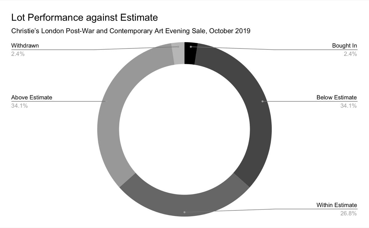 artsy_Christie’s capped the Frieze Week evening auctions of contemporary art in London on Friday with a muted sale at its King Street headquarters. The auction was led by works from three major market forces that all underperformed against their estimates. The Christie’s sale brought in a total hammer price of £54 million ($66.5 million), falling well short of the high estimate of £79 million ($97.4 million). With fees, the sale’s total was £64.5 million ($79.5 million).
