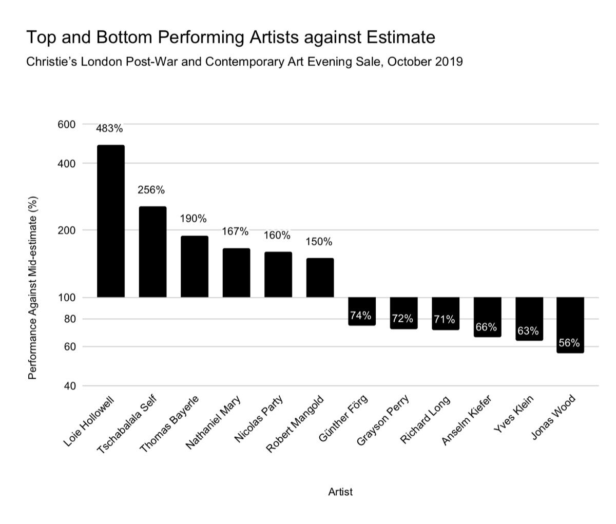 While major painters produced very mixed results, works by a younger generation of artists inspired much more spirited bidding. Works by young market sensations Loie Hollowell