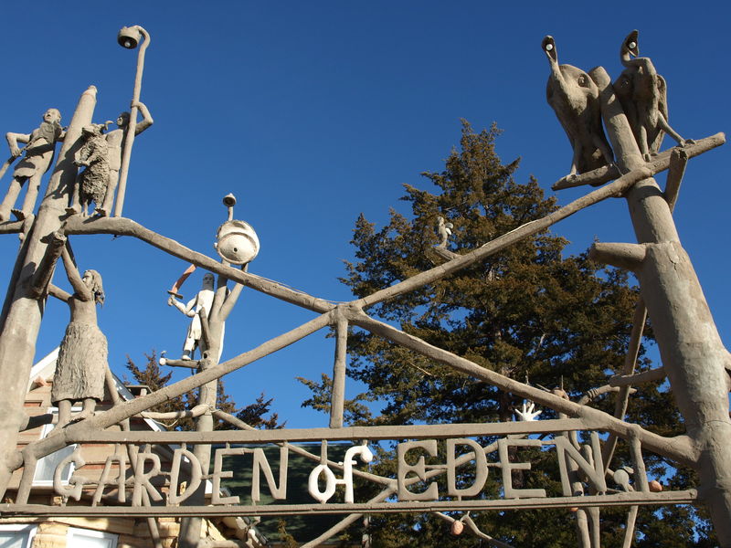 “With a population of around 400, Lucas is known as the ‘Grassroots Art Capital of Kansas.’ The first and foremost installation was built between 1907 and 1928 by Samuel P. Dinsmoor, an outsider artist. The Garden of Eden consists of Dinsmoor’s home, a limestone ‘log cabin,’ and about 150 large cement sculptures on the property that represent the artist’s interpretation of the biblical creation and world history, topped off with Dinsmoor’s mausoleum.