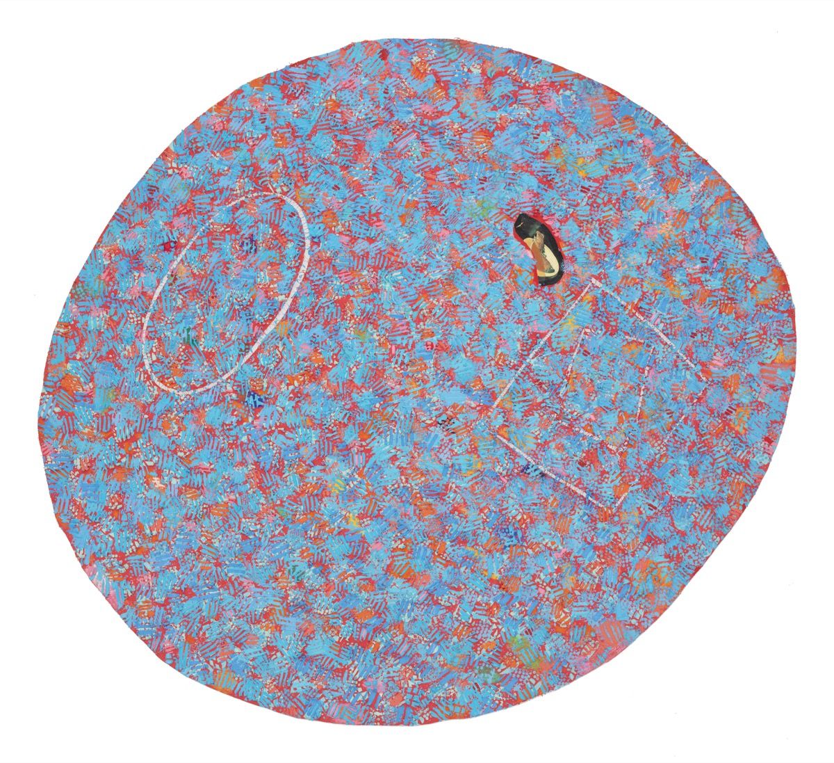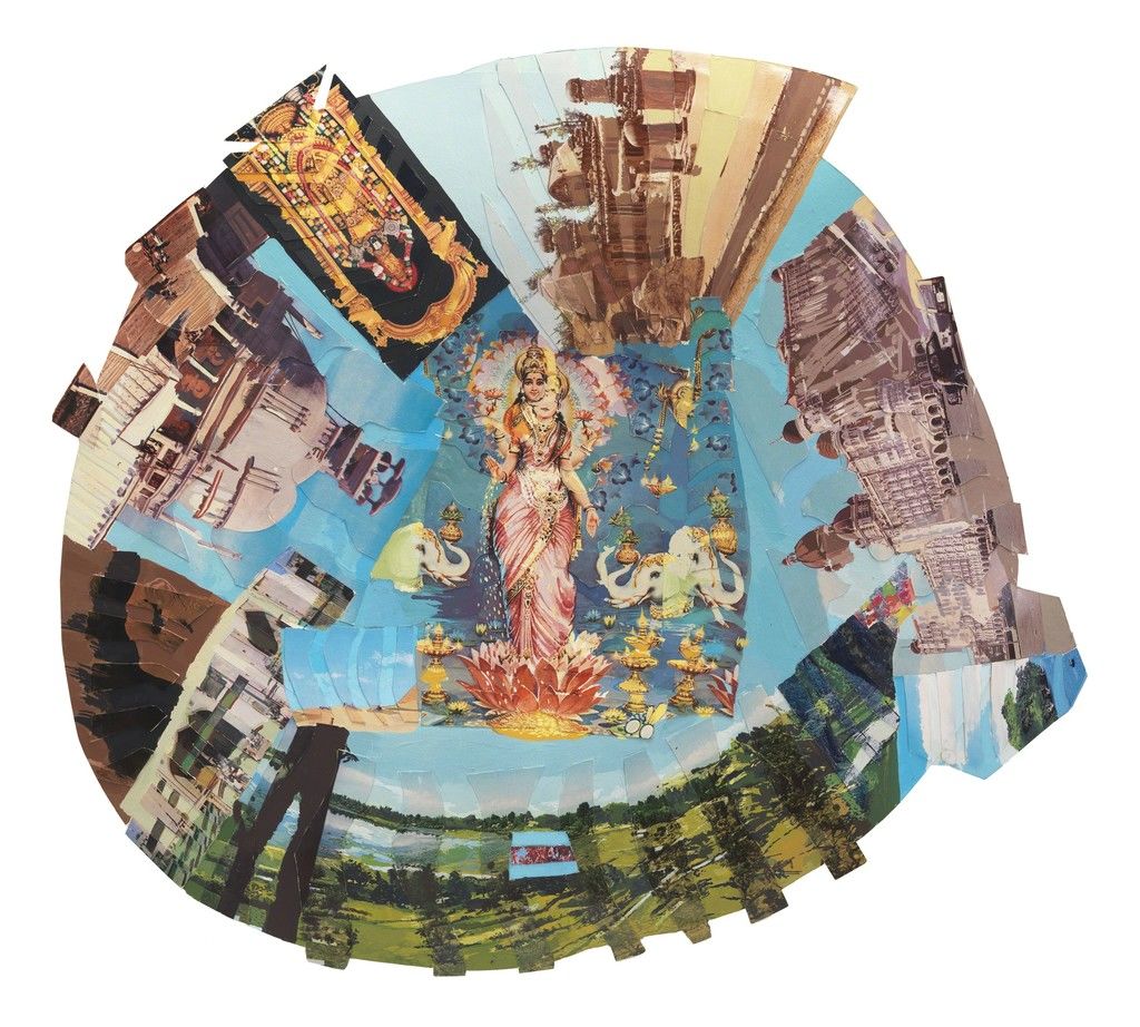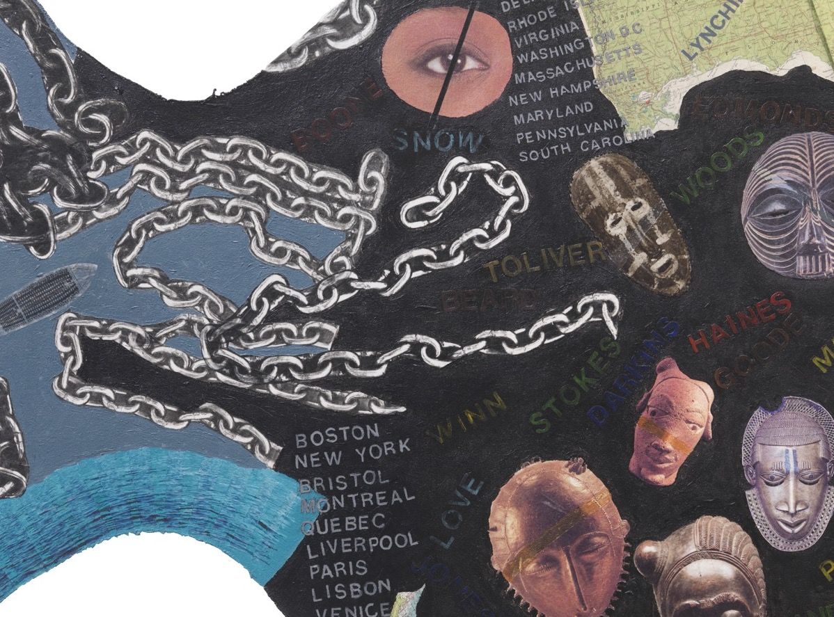 In Autobiography: Oval Memory #1 (1980–81), Pindell sought to consolidate her memories post-concussion. For decades before the accident, she had collected postcards and photographs from her global travels; these, she said, only became useful to her after the crash. In the work, viewers are confronted with these relics, which the artist cut into strips before adding them to her canvas alongside acrylic paint. There’s a scintillating sense of fragmentation here that can only be experienced by taking a close look at the works from the series, both individually and holistically.