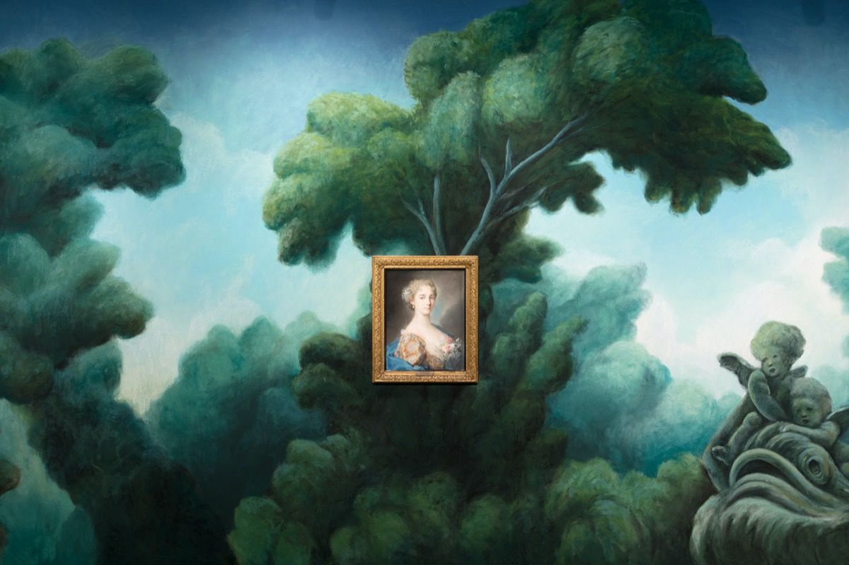 portrait against his own reproduction of elements from Jean-Honoré Fragonard’s The Progress of Love (1771–72). Narrow archways provided glimpses into other spaces colored in deep pinks, purples, and yellows.