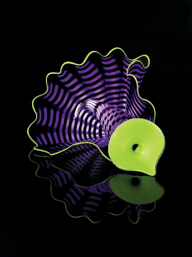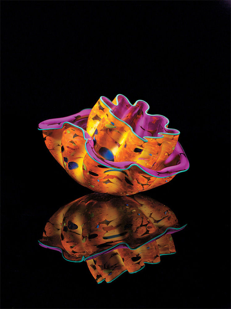 Chihuly’s best-known installations—mounted by museums, botanical gardens, and hotels worldwide—can evoke full-scale, sunshine-yellow trees or multistory towers of aqua and chartreuse curls. His giant, asymmetrical bowls, or “macchia,” resemble seashells, while his “chandeliers”—20-foot-long tangles of blown glass—descend from lofty ceilings.