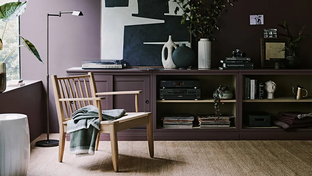 This grape colour with a chalky, matt appearance is enveloping but not dark enough to feel oppressive. It's called "clove" and is part of furniture company Neptune's range of water-based paints that are low in VOCs (volatile organic compounds). Its mauve colour clearly doesn't resemble the brown tinge of cloves used as a spice, but it's deliberately conceived to be ambiguous and hard to pinpoint. "It summons images of juniper berries and dark wood," says Fred Horlock, Neptune's design director. "It hovers between a decadent plum shade and deep brown." Yet despite its subtlety, the plum shade makes a strong statement because it's a rare choice of colour. This is emphasised in this room, which evokes a bohemian, mid-century mood with its 1950s-style furniture, ceramics and abstract art.