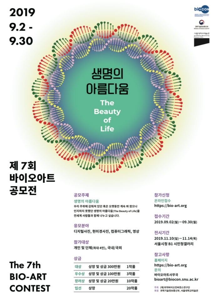The 2019 7th Bio-Art Contest will be held by Medicinal Bioconvergence Research Center from Seoul National University, and Sponsored by Ministry of Science and ICT in the Republic of Korea and Museum of Art in Seoul National University.