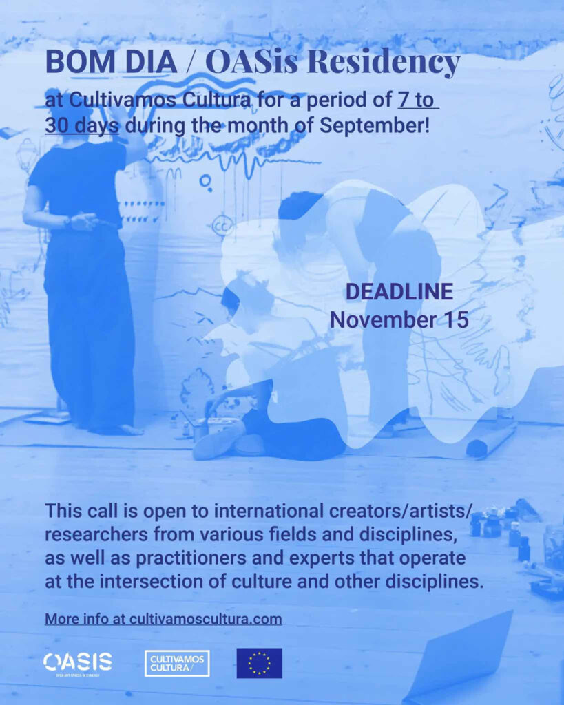 For 2026, one proposal will be selected to join the “Bom Dia” OASis Residency, at Cultivamos Cultura for a period of 7 to 30 days during the month of April.