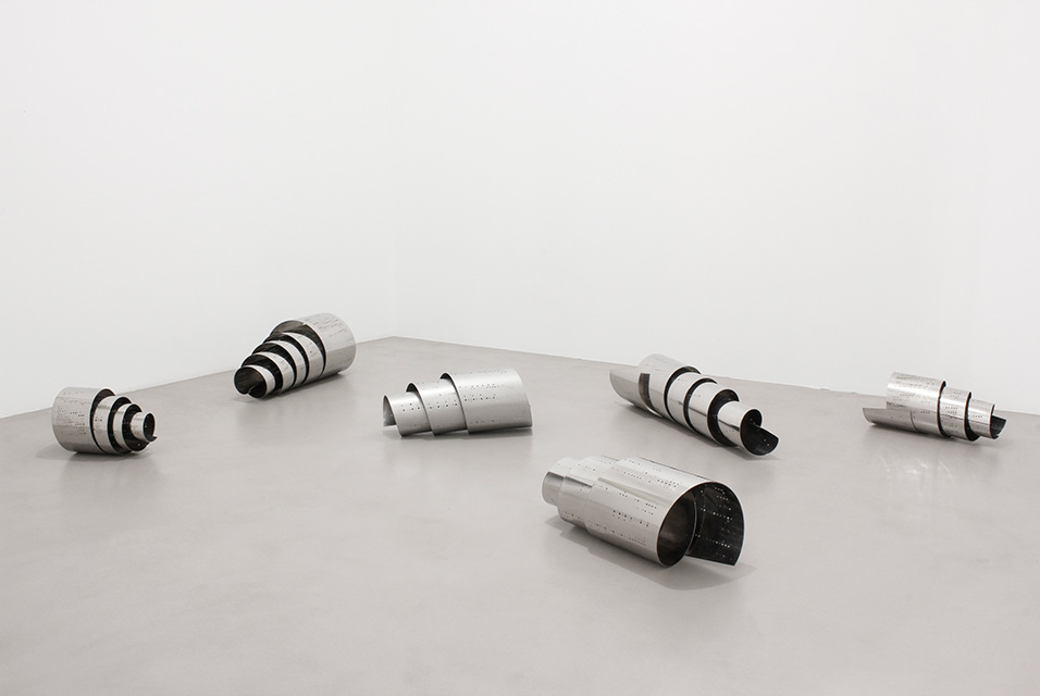 Riccardo De Marchi is presenting his most recent works in a new exhibition installation specially created for the gallery space. By using the Greek term Ñp» – which can be translated as “hole“ or “opening“, but also as “sight“ or “eye socket“ – the title of the exhibition conveys the idea of vision “through“ a hole, or holes. In his works, as in the case of 12 pagine [12 Pages] and 9 pagine [9 Pages], on display in the first room on the upper floor, the artist perforates the material to create a continuous contrast between surface and volume, presence and absence. The perforation-script shows the traces of its passing in a journey that is both mental and metaphorical, as well as physical. De Marchi repeatedly brings to bear different ways of seeing, partly depending on the material used, as we see in the installation in the second room on the upper floor. Here, some steel works in the form of sheets rolled on themselves are placed on the ground.