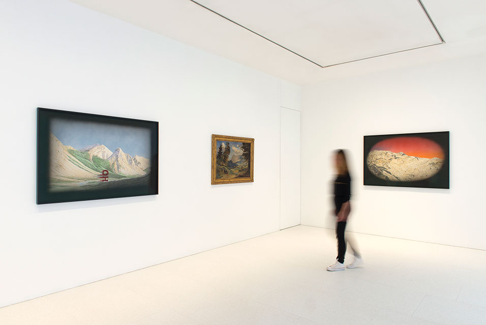 In 2017, Ruscha began Spied Upon Scene, a series depicting majestic mountainscapes that resemble the idyllic ranges of travel books, postcards, adventure movies, or the Paramount Pictures logo. The series descends from his earlier Mountain Paintings, in which inscrutable phrases, laid over the mountain images, become a wry and physical presence in the landscape. The mountains of Spied Upon Scene, however, are partially restricted from view, visible only through oval-shaped lenses or window grids. Like the Mountain Paintings, they seem to refer to the nineteenth-century tradition of the American Sublime; in fact, their lineage includes an obscure American painter from the turn of the century, Louis Michel Eilshemius, whose use of painted frames became an influence on Ruscha’s own approach.