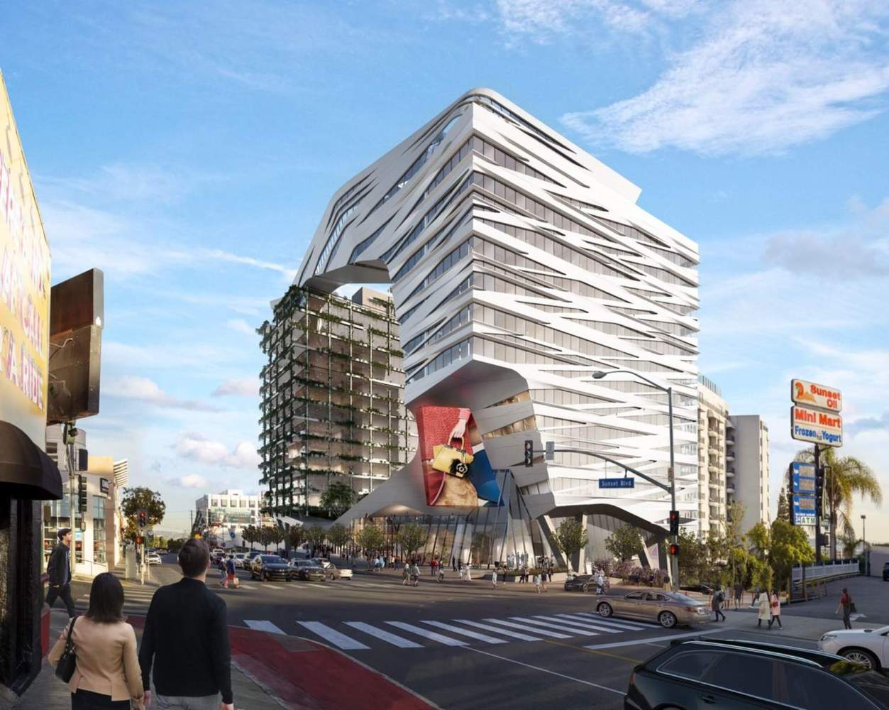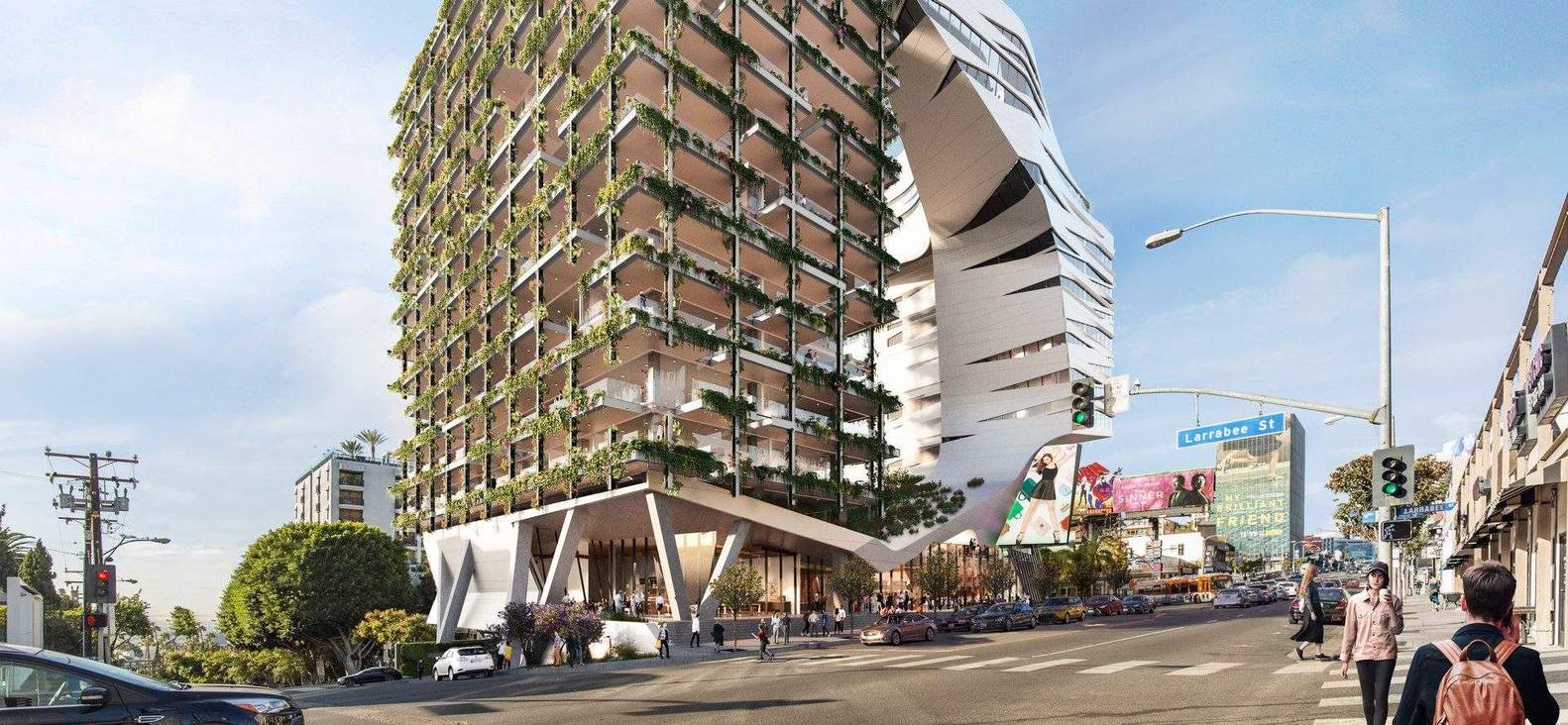 Archdaily_ Morphosis has unveiled new images of the proposed 15-story mixed-use development along the Sunset Strip in Los Angeles. Spanning along Sunset Boulevard between San Vicente Boulevard and Larrabee Street, the 369,000-square-foot building is designed with a gym, movie screening room, and a rooftop pool. The project would include a new home for the landmark Viper Room, as the sinuous residential tower and hotel redefines one of L.A.'s most iconic streetscapes.