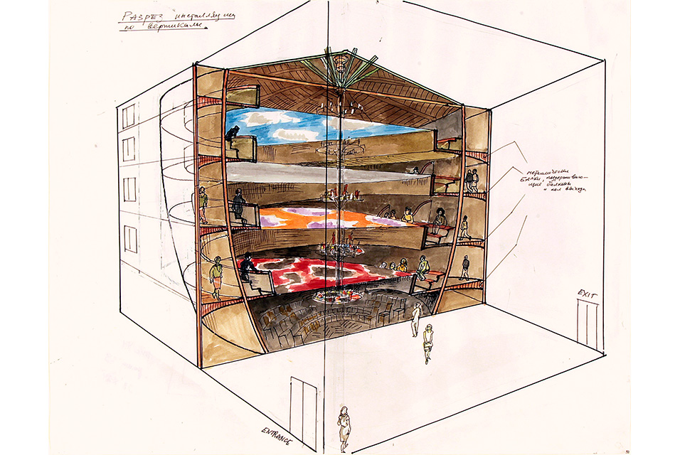The show In the Making: Ilya & Emilia Kabakov. From Drawing to Installation brings together a selection of sketches and colourful drawings for opera and their famous installations The Toilet realized at the IX Kassel Documenta in 1992, The Palace of Projects permanently installed at the Zeche Zollverein, and The Red Pavilion , which was exhibited at the 45th Venice Biennale in 1993. Along with these and other drawings for built projects as well as set designs, we see ideas for their unrealized installation Vertical Opera to be performed in the Guggenheim Museum, and for an angel that falls from the sky called The Fallen Angel , an installation that was proposed for New York’s Whitney Museum. Most of the drawings on display do not reflect a thinking process that leads to their large-format installations, but rather an idea that exists from the very beginning in the minds of the artists and then through various sketches and drawings is realised.