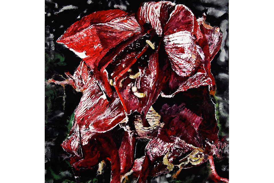 By embracing the theme of flowers, Philippe Cognée seems to have chosen yet another banal subject. His sunflower hearts, peonies and amaryllis, dried or wilted, are, however, so vastly enlarged and so deformed by the wax that they are hardly recognizable. His encaustic techniques have become more complex than ever. Applied with a brush or slow-dripped, smoothed with an iron or artificially corrugated, wax presents itself as a material split between two states, echoing the ephemeral in-between state of these flowers, between life and death.