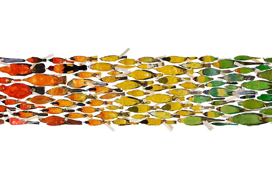 The centerpiece of the show is Prosek’s Bird Spectrum, an installation created from 222 bird specimens from the Peabody’s ornithology collection, which are affixed to the wall and organized by color. Spanning more than 15 feet, the avian rainbow suggests that in the color spectrum, as in the evolutionary continuum, clear lines do not exist. Where, for example, does red end and orange begin? Likewise, it is often difficult to define where one species ends, and another begins in the evolutionary timeline.