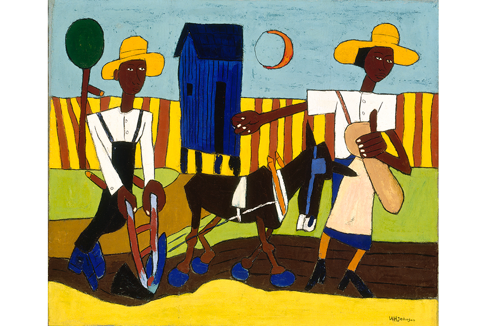 The works of Benny Andrews, Ellis Wilson and William H. Johnson speak to the dignity and resilience of people who work the land. Jacob Lawrence and Thornton Dial, Sr., acknowledge the struggle for economic and civil rights. Sargent Johnson, Loïs Mailou Jones, and Melvin Edwards address the heritage of Africa, and images by Romare Bearden celebrate jazz musicians. Sam Gilliam, Felrath Hines and Bob Thompson conducted innovative experiments with color and form. These artists created an image of America that recognizes individuals and community and acknowledges the role of art in celebrating the wide-ranging nature of American society.