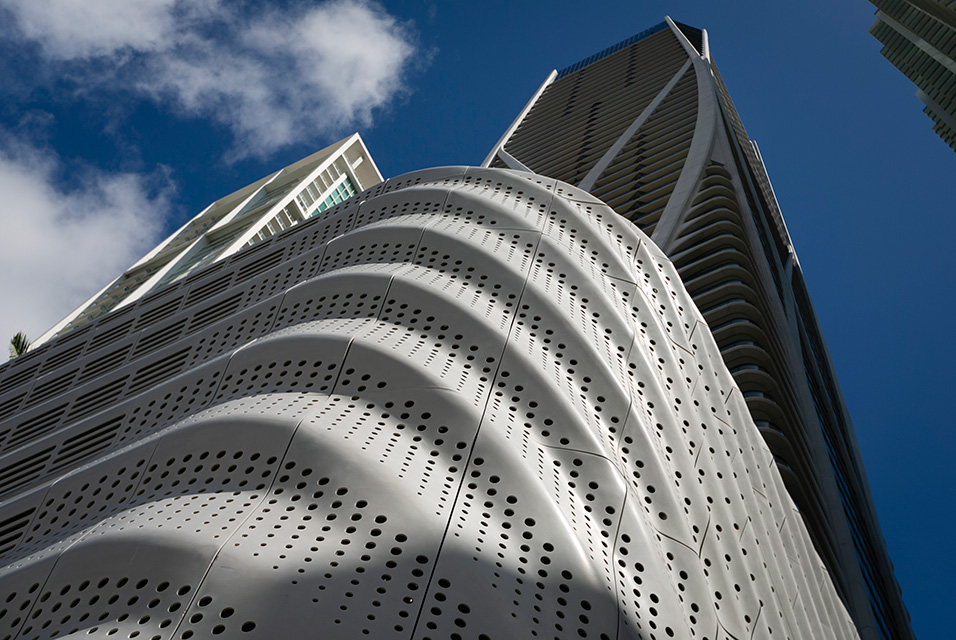 The unique curved "exoskeleton" design of the One Thousand Museum building has created buzz. The futuristic structure is the only residential space in downtown Miami with a helipad.