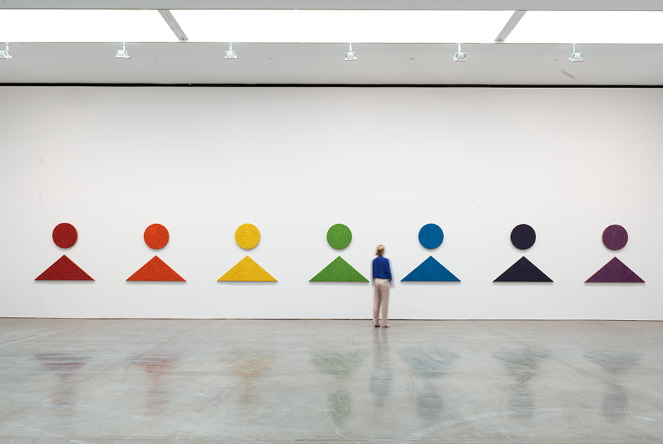 Also on view are two horizontal landscapes—a sunset and a sunrise distinguished by Turneresque washes of light—and a triptych of bright yellow “painted universe mandalas.” The underpaintings of the latter works are covered with marks that emanate from a central focal point positioned on the canvas to correspond with where the heart is located in the human body. In other works, Guidi re-creates two systems of eighteenth- and nineteenth-century color theory: Johann Wolfgang von Goethe’s triangle in An Essential Order (Goethe) (2019) and Ignaz Schiffermüller’s color circle in Your Colors Are Eternal (Schiffermüller) (2019). These paintings interpret illustrations by the German literary titan and the Austrian naturalist that visualize their shared belief in the profound effects of color and its impact on human emotion and behavior. In connecting Goethe’s map of the human mind linking colors and feelings with Schiffermüller’s attempt to capture the colors produced by nature, Guidi unites “color, shape, nature, and philosophy.”