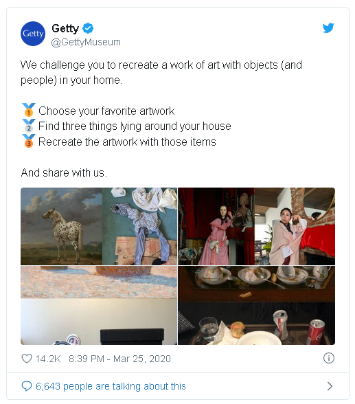 The institution issued the challenge to its Twitter followers on Thursday last week: choose your favourite artwork, recreate it using three items lying around your house and share it with the world on social media.