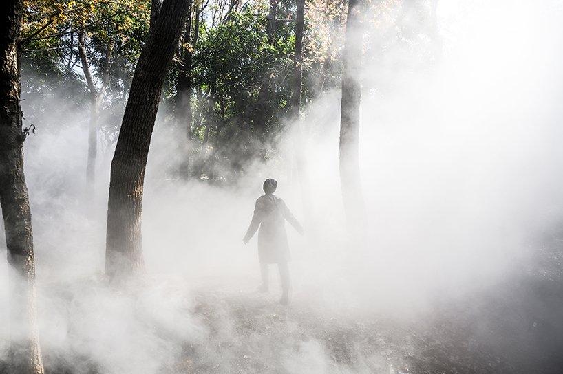 ‘sprinkling the mist while attaching the tree trunk,’ comments the artist on her webpage. ‘interweaving a scenery with the forest which is inside the deep mountain. sight with clarity or blur. light stream lead the mysterious mist to venture the forest. found a light object under the crowd of trees which is constructed by blend woods. wood sticks are overlapping and winding as a hollow pinecone. its construction and pattern go well with the line of the treetop. it’s a whispering between human and the nature.’