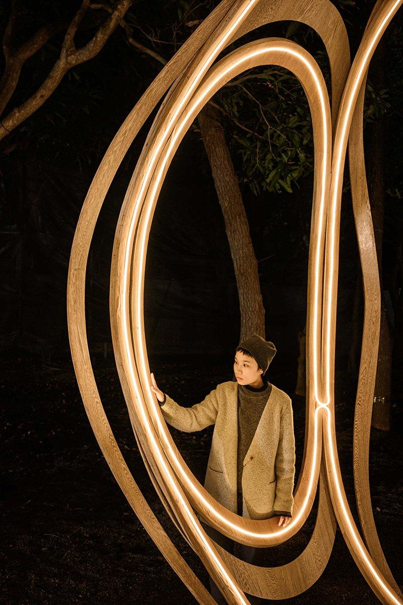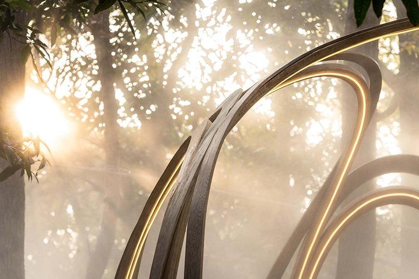following the theme, artist ling-li tseng, in collaboration with serendipity studio, created a light installation called ‘the search of the glow’. set amidst the forest, the minimalist, spectral installation boast a sphere shape made of wooden ovals. the inside of this structure is covered in LED tubes, exuding a glow that covers the forest. this glow transforms into a mist that guides visitors into the temporary light pavilion.