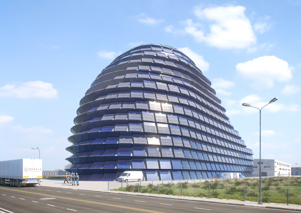 Located in Changhua Coastal Industrial Park near Taichung, “Solar Rock”, a storage and maintenance facility for sustainable energy equipment, is designed to maximise solar energy production. The dome-like structure increases the area of the building exposed to the sun in the mornings and evenings, and the series of pleats along the façade are adjusted to maximise the energy-generating potential of the solar panels they support. The building would be energetically self-sufficient, and options are being considered to generate surplus energy to contribute to the grid.