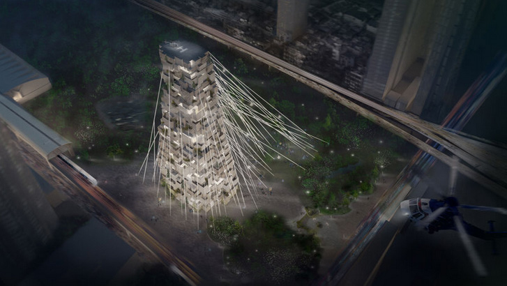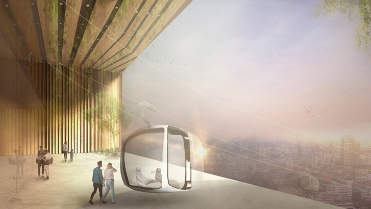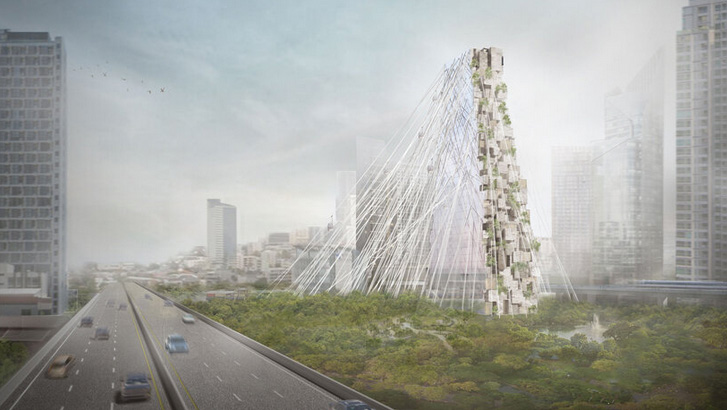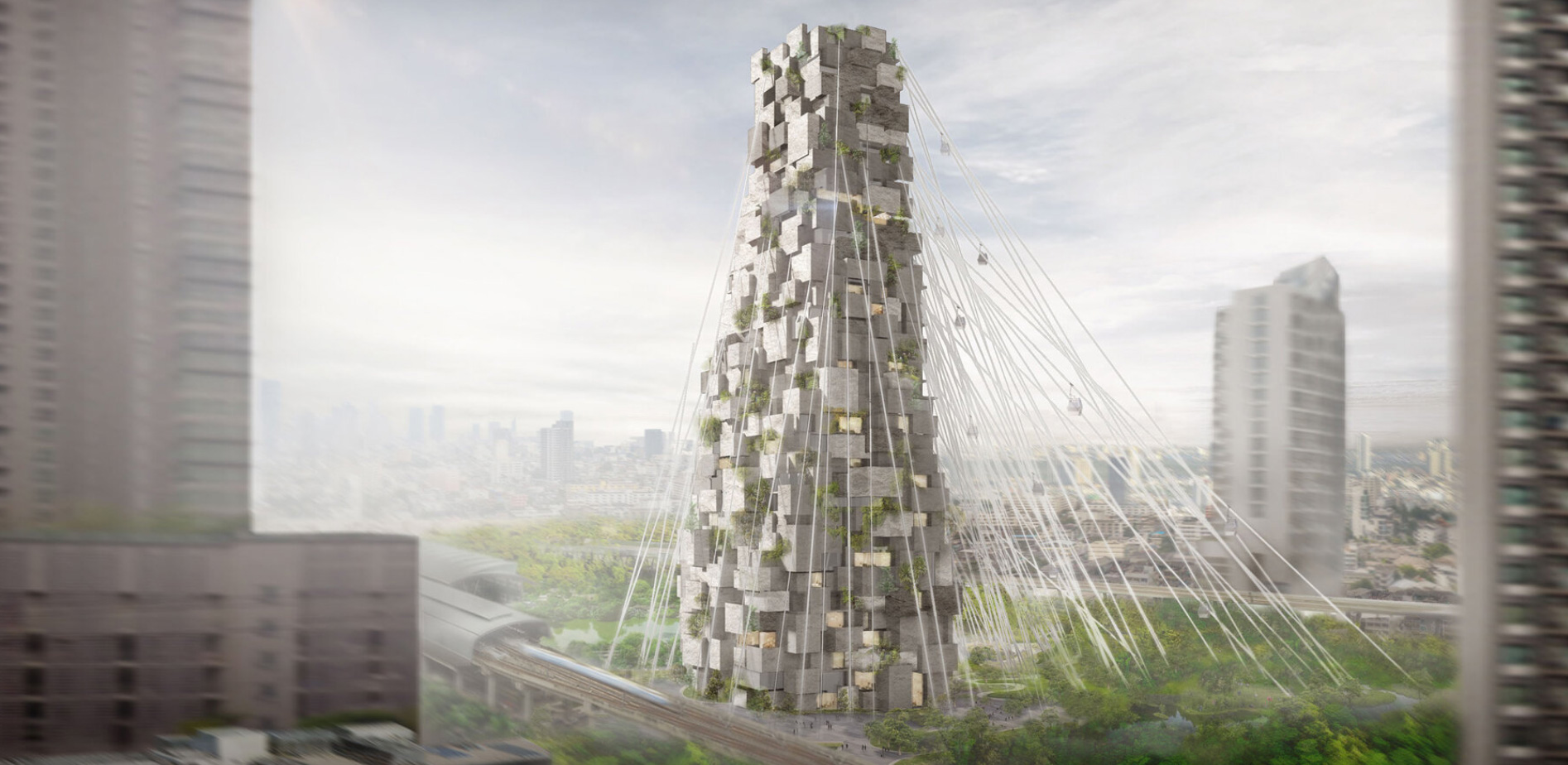To connect architecture and nature, the team designed a tower of two halves. One half of the building is stacked like stones and populated with vegetation to make it look like an extension of nature. The other half features a mirrored façade with cable car lines that connect the building to its green site, which is set to become ‘Bangkok Civic Park’ under the second phase of the development project.