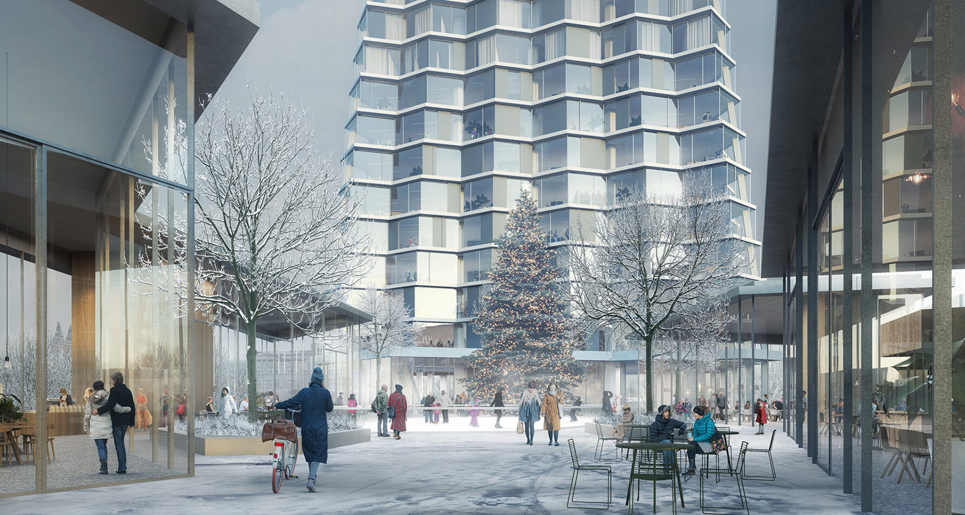 the shape of the ostrava tower is designed by CHYBIK + KRISTOF to expand out, offering expansive views with its sky garden, while simultaneously level zero connects the lobby to its new square, expanding and activating public space. the new plaza is designed in a way that it correlates to the scale and purpose of the inside spaces.