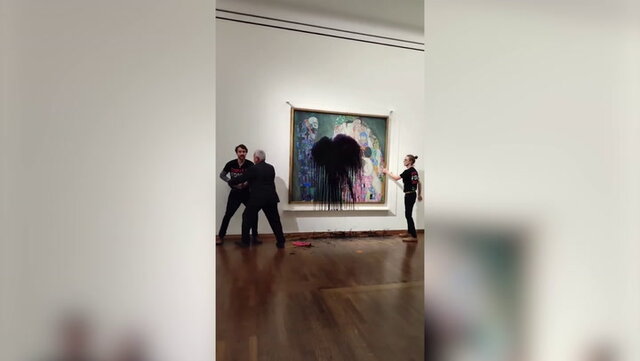 After the attack, police arrived at the museum and the black liquid, which the activists had brought in in a hot water bottle under their clothes, was cleaned off the protective glass, the Austria Press Agency reported.