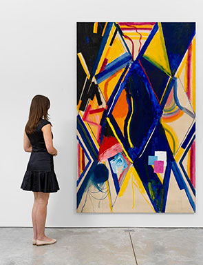 The qualities that characterize his work — intense colors and boldly articulated shapes coupled with ethereal textures and improvisational structures — are shared by the seven contemporary artists selected for the show: Marina Adams, Matt Connors, Joe Fyfe, Joanne Greenbaum, Eric N. Mack, Monique Mouton, and Peter Shear.