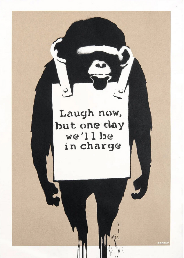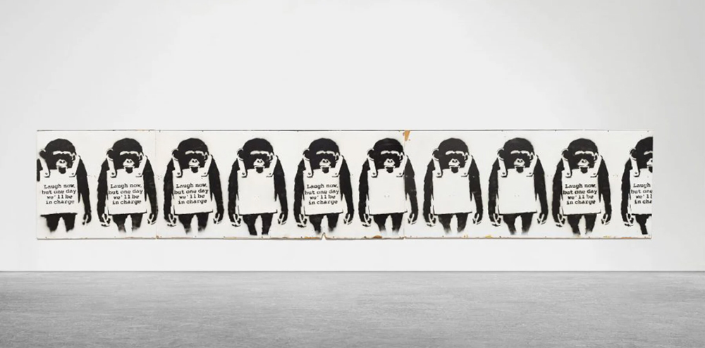 Designboom_ After a year-long legal battle with EU courts, Banksy’s cover remains intact, and his work protected. The news comes after a board of appeal reversed its 2021 decision to invalidate the trademark for the elusive artist’s iconic depiction of a monkey holding a sign around its neck that reads: ‘Laugh now, but one day we’ll be in charge’.