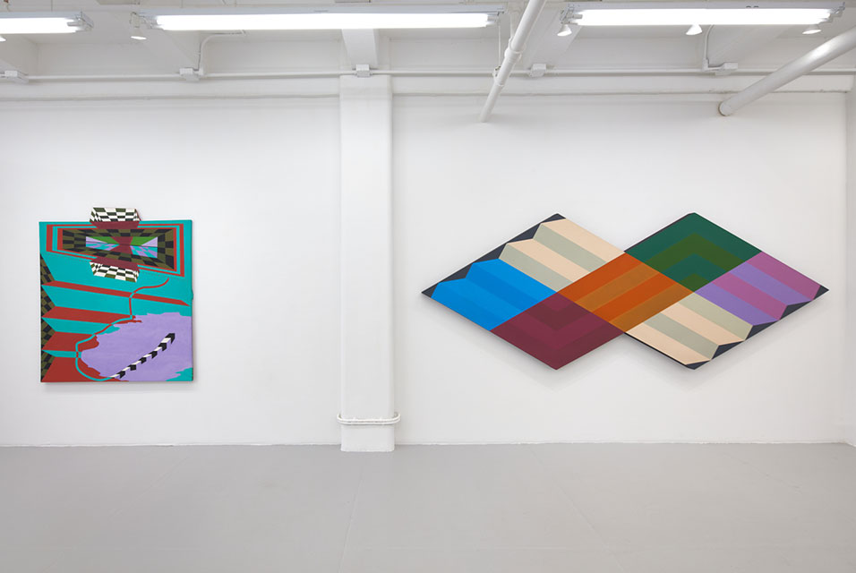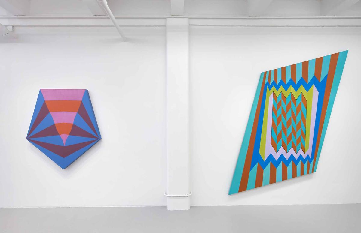 This presentation includes 8 geometric, hard-edge, and color-based abstract paintings from 1963 to 1965, all acrylic on canvas and created in California, and 4 drawings from 1966, 1975 and 1977. Together, these paintings and drawings map Davis’s early explorations of illusory space and optical effects in the two-dimensional picture plane: starting from the early 1960s paintings in this exhibition and minimalist monochrome paintings from 1965; to his very well-known large scale shaped dodecagons, cubes and slab cast resin paintings (1966-1972); then to the perspectival Snapline (1975 – 1978) and geometric Floater(1978 – 1979) series, both acrylic paint on canvas.