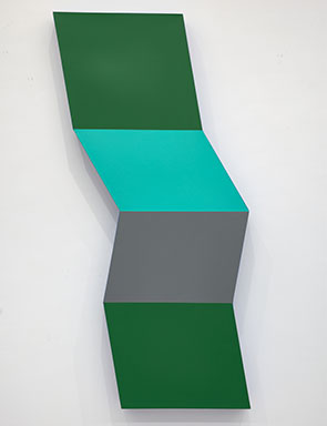 In the early 1960s, Davis was fresh out of his studies at the San Francisco Art Institute, heavily influenced by Jackson Pollock, Clyfford Still and expressionism, he wanted to find his own voice and visual language. Stating that he “strove to expand the boundaries of painting, not the boundaries of what was then becoming art”1, he did so by focusing on extreme vector geometry, potent color interactions, and optical effects. More specifically, Davis stated, “I set up tensions in my paintings; between the flatness of the canvas and the illusion of the depicted abstract objects; between the painterly and the hard edge; between color and color; between light and shadow. These paintings attempt to probe the dimensions of time and space, while not existing in time at all, the whole artwork being viewable in an instant.”2 The combination of dualities and internal tensions within each painting resulted in imagery expanding (literally) and popping (figuratively) out of a traditional square or rectangular picture plane and into shaped perimeters that gave the illusion of rectangular boxes, pentagons, parallelograms, diamonds, and bent planks, each protruding off the wall. Such illusions became an easy leap to painting much larger, intensely optical imagery leveraging three-point perspective in cast polyester resin, protruding canvases, encaustic on shaped wood supports, expanded PVC, and canvases in various shapes and sizes.