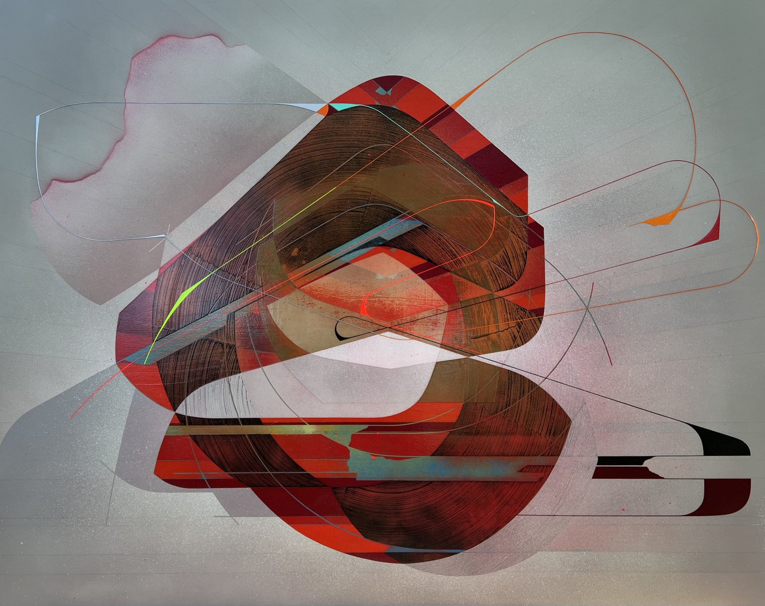 A synthesis of styles and processes particular to the artist's experience materialize on the canvas to construct the poetics of his investigations. Masking off portions of the painting in his process recalls the batik technique of wax-resist dying and geometric patterning used in his father’s birthplace of Java, Indonesia, a former Dutch colony. His parents met in the Netherlands and immigrated to the U.S., making Couwenberg a first-generation Eurasian American. This synthesis of cultures manifests in his pristine Neo-Plast lines, which disrupt the rigid grid of De Stijl to formulate topsy-turvy cartographies embedded with encoded sign- systems. The alternating black-and-white banding alludes to “Invasion Stripes” used by Allied forces to define friendly aircrafts on their fuselages and wings during World War II but can also refer to Chevron stripes. The industrial spray gun is employed to create diaphanous atmospheric effects, where the foreground and background oscillate, while pearlescent paints shimmer on the surface. Couwenberg lacerates striations on portions of the architectonic compositions with tools such as brooms, all the while revealing intersections between the complex networks of positive and negative spaces. These circuits are comparable to the labyrinthine freeways Angeleno’s surmount and the dextrous, freestyle choreographies skaters wreath. Couwenberg orchestrates self-portraits that intimate a collective unconscious unveiled through material and process, ultimately converting them into cultural artifacts.