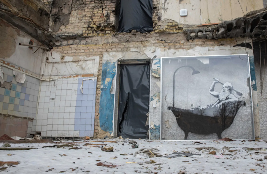 Oleh Torkunov, the deputy head of the Kyiv Regional Military Administration, says: “Banksy’s works have cultural and historical value for the country as a reminder that light will win over darkness. It is important to resist possible vandalism attempts that have already happened.”