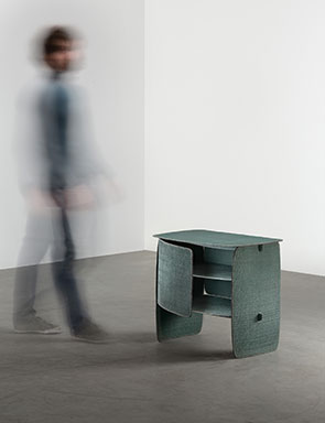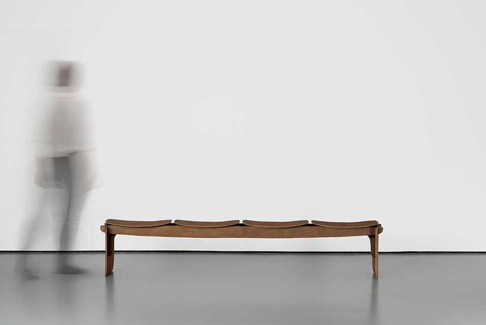 The Tiss-Tiss artworks display a relief of fabric on the surface and sewn stitch imprints on the edges of each sand-cast aluminum component. The artists capture a moment in time during which the linen fabric is carefully laid out and emphasize the beauty of traditional hand-weaving techniques and the resulting irregularities in the cloth. The fluid impression of the textile imprint is juxtaposed with the architectonic, self-supporting structure of the rigid aluminum plates. From a distance, the furniture seems soft and made in fabric, but close you realize that it’s rigid and made in aluminum.