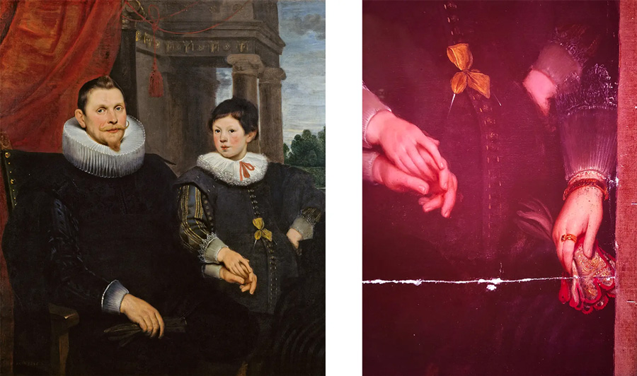 Above left: Cornelis de Vos, Double Portrait of a Father and Son (1626), and, above right, a detail of the lower right-hand corner of the cleaned painting