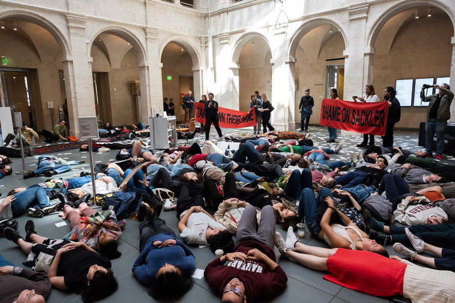 As has been the case at other PAIN-organized protests, such as those held at the Guggenheim and the Met, protestors held a die-in, lying in the atrium of the Harvard Art Museums alongside students at the school that Goldin herself once attended. They specifically targeted the Arthur M. Sackler Museum, one of the three institutions under the umbrella of the Harvard Art Museums, and another building on campus named after the same patron.