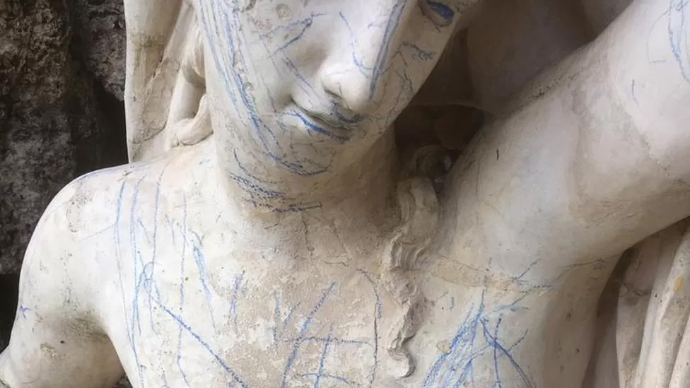 Museum staff were left dismayed after a historic statue was scribbled on.