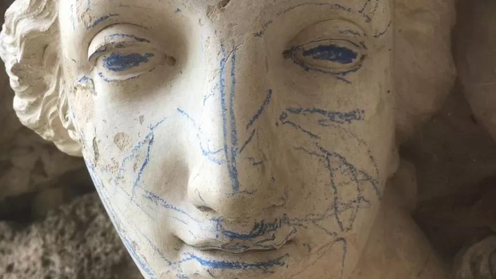 Bbc_ Bright blue crayon markings were scrawled across the face, arms and torso of the 230-year-old Sabrina statue at Croome, Worcester.