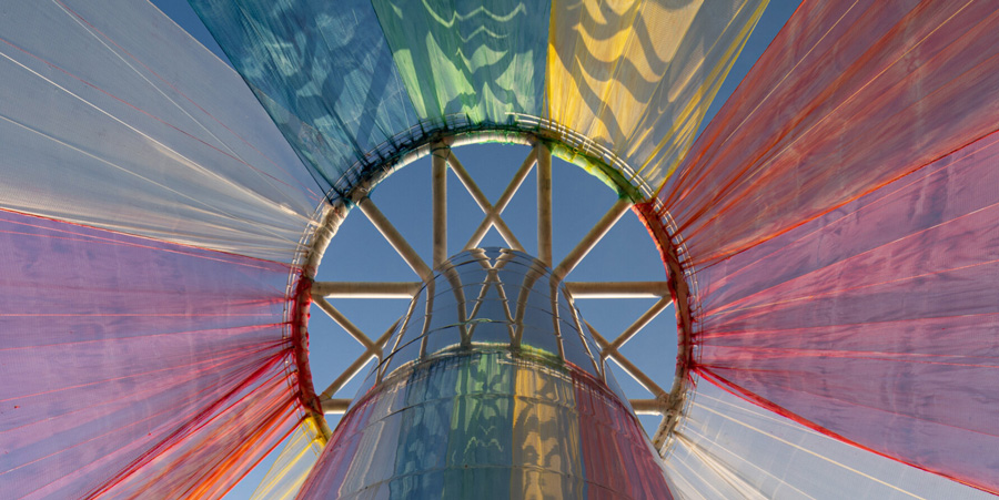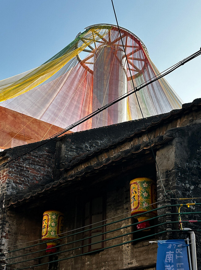 Designboom_ Lightly enveloping and cladding the abandoned Taiping market building in Guangdong, China, ‘Timeless Beacon’ by MAD Architects emerges as a symbol of rebirth for a once bustling commercial hub. The practice’s lead architect Ma Yansong was invited by the Guangdong Nanhai Art Field to complete the ethereal and colorful art installation, currently on show at Taiping Xu Art Zone until the Summer of 2024.
