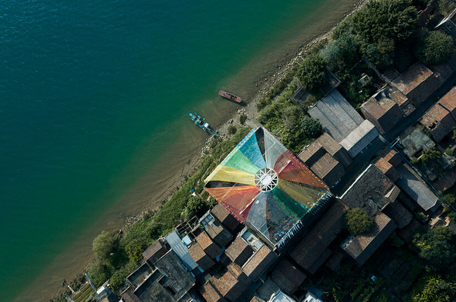 In light of Ma Yansong’s vision for the abandoned hub, the resulting installation sees the three-story commercial landmark wrapped in reflective film. This new material blurrily mirrors the surrounding old streets through the building’s façade and inner space, respectively. At the top, a towering multimedia light device is enveloped in colorfully delicate pieces of cloth, fluttering in the wind like ethereal drapes. At night, the rooftop transforms into a sort of ‘lighthouse’ for the quiet village, creating a dreamy aura along the bankside.