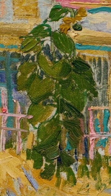 In the centre of the composition are several giant sunflower plants, apparently much taller than a person. It would be just a year later, in Provence, that Van Gogh created his famed Sunflower still lifes.