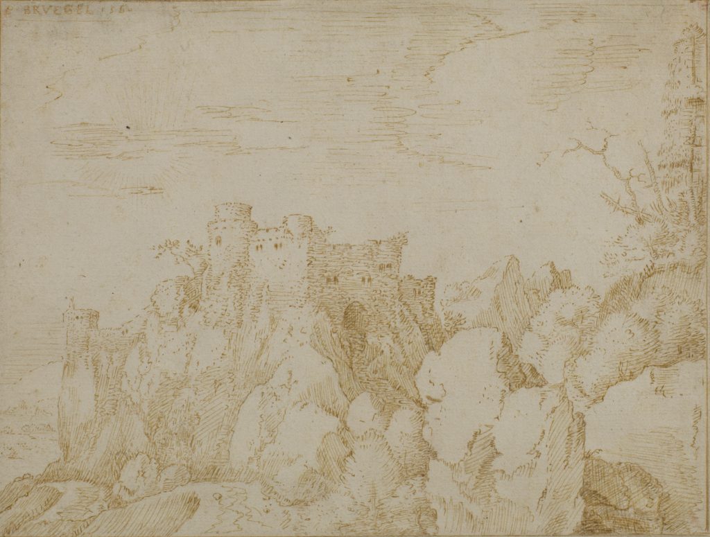 Jacob Savery I, Forgery in the manner of Pieter Bruegel the Elder, Rocky landscape with a castle (c. 1590)