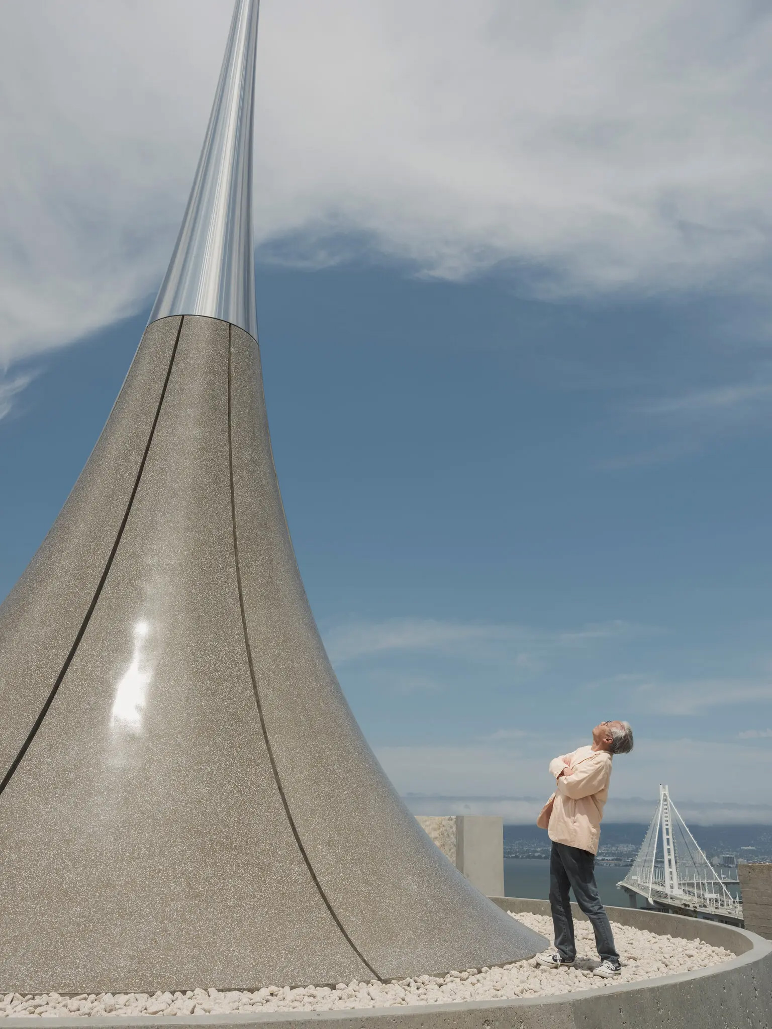 From some viewpoints it looks like the tip of a sewing needle poking out above the trees and cellular towers of this island in the San Francisco Bay. From others it seems an elegant high-tech cousin of the Transamerica Pyramid, the chunkier building across the bay. Because of its particular curved geometry, which tapers from a concrete base of 23 feet to a top that is less than 1 inch in diameter, the sculpture looks as if it’s growing infinitely smaller and taller as it reaches for Earth’s outer atmosphere.